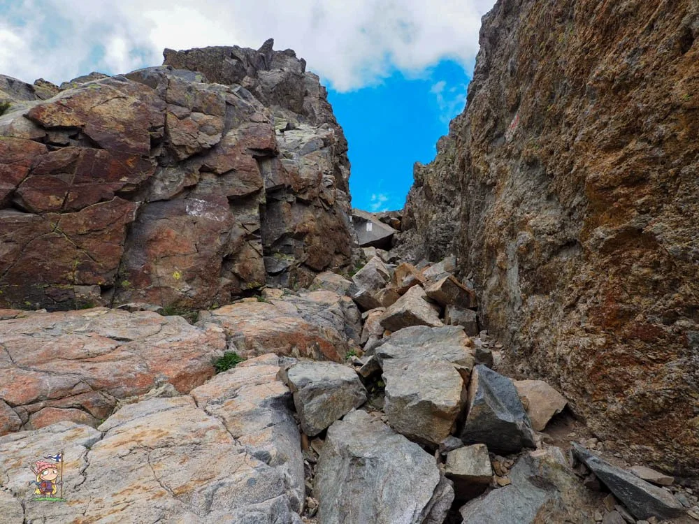 Col du Palasiin (2517m) ei ollut ollenkaan polkua, vaan reitti piti löytää itse kivikon halki. Sinne tänne oli reitin merkiksi kasattu kiviä, mutta etsipä isosta kivikasasta pieniä kivikasoja, ei niin helppoa. Eikä sillä ollut väliäkään, kunhan suunta oli ylöspäin niin kaikki hyvin. Solan päällä en meinannut löytää sieltä eteenpäin jatkuvaa reittiä vaan harhailin kivikossa jonkun aikaa, ennen kuin vain päätin lähteä suurinpiirtein oikeaan suuntaan. Solasta piti siirtyä korkeuskäyriä seuraten seuraavaan solaan, ja siinä matkan varrella löysin jonkunlaisia reittimerkkejäkin. Seuraava sola, Port du Lavedan (2615m) olikin tosissaan kuin portti toiseen maailmaan. Se oli kapea aukko vuorenseinämässä, jota pitkin piti kiivetä ylös. Tämä vaati jo vähän kiipeilyliikkeitä ja jyrkimmässä kohdassa jouduin yrittämään parikin kertaa ennen kuin löysin oikean reitin.