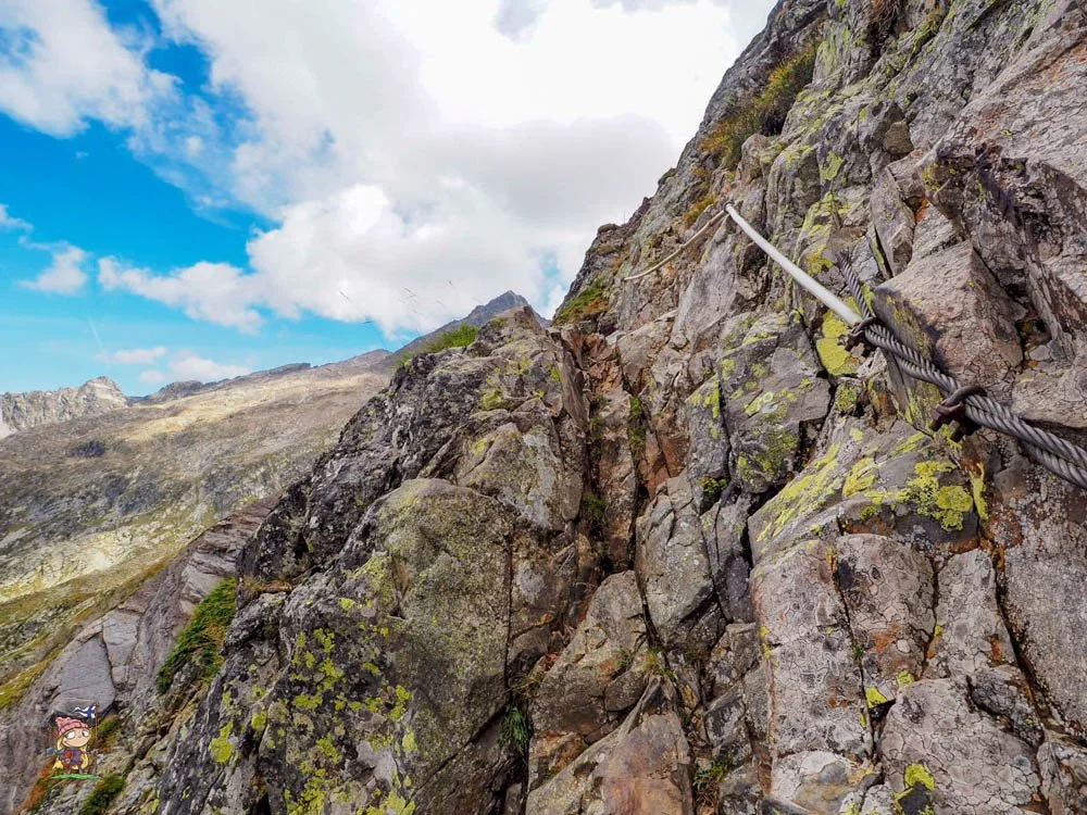 Solan päällä piti päättää meneekö helppoa vai vaikeampaa reittiä seuraavalle majalle, valitsin tietenkin sen vaikeamman. Passage d’Orteig on pätkä polkua, jossa se kulkee hyvin kapealla kielekkeellä korkealla jyrkänteellä, mutta seinään on sentään pultattu kaapeli mistä voi pitää kiinni. Hankala osuus oli vain noin 100 metriä pitkä ja pian sen jälkeen saavuin Refuge d’Arremoulitille. Tämä maja oli rakennettu aivan tajuttoman kauniiseen paikkaan, syvän sinisten vuoristojärvien ja vuorten väliin. Vesi järvissä oli niin upean kirkasta, ettei sellaista ole monessa paikassa. Olin ajatellut syöväni majalla jotain, mutta keittiö olikin sillä hetkellä kiinni ja aukeaisi vasta reilun tunnin kuluttua. En halunnut jäädä niin pitkäksi aikaa odottamaan, joten pienen tauon jälkeen heitin repun selkään ja lähdin taas kohti seuraavaa solaa.