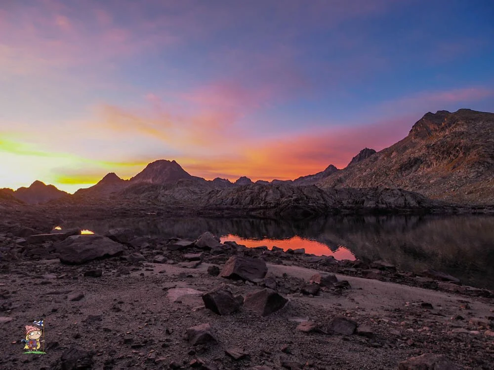 Eilen illalla juuri ennen kuin nukahdin, olin kuulevinani puhetta jostain läheltä. Mutta kun kurkistin ulos teltasta, näin vain sumua. Yöllä sumu hävisi ja tilalle vaihtui todella kirkas kuutamo. Kuu oli korkealla vielä silloinkin kun aamulla pakkasin reppuani ja aamu alkoi valjeta. Auringonnousu värjäsi pilvet vaaleanpunaisiksi ja tämä kaikki heijastui peilityynen järven pinnasta. Liikkeelle lähdettyäni löysin seuraavan kumpareen takaa saman saksalaisen pariskunnan, jonka tapasin leirintäalueella Benasquessa. Illalla kuuluneet äänet eivät siis olleet mielikuvitustani, vaan ihan oikeita! Pariskunta vaeltaa GR11:sta, joten varmasti törmätään vielä uudelleenkin.