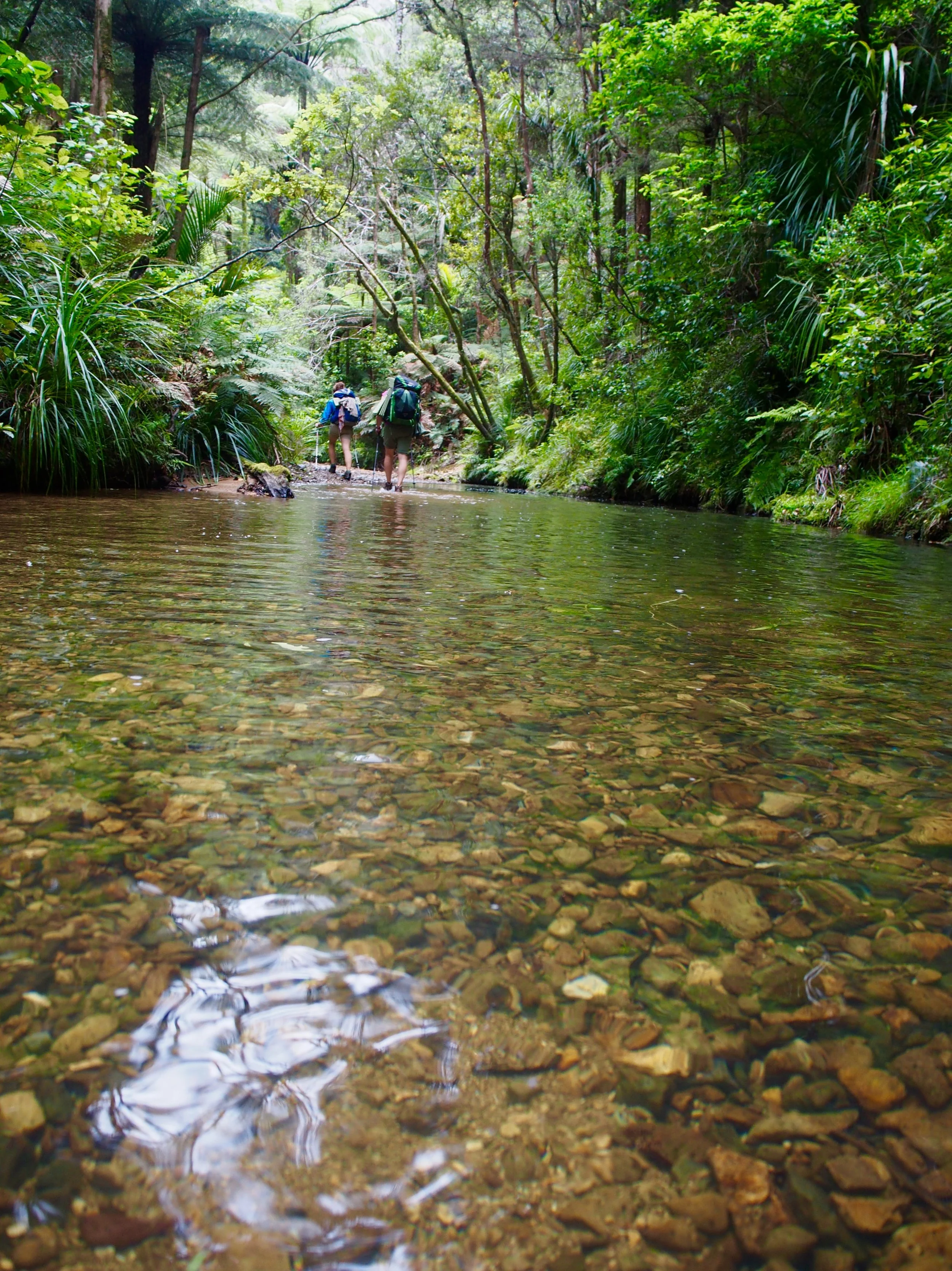 Reilun tunnin tiekävelyn jälkeen oli vuorossa noin 4 km jokea pitkin! Jokipätkät ovat ihan ehdoton suosikkini tähän mennessä. Vaihdoin taas sandaalit jalkaan ja lähdin kahlaamaan. Näin joessa metrin pituisen ankeriaan, se katseli ensin puoliksi uponneen puunrungon alta, mutta uskaltautui kohta uimaan lähemmäksi. Mielessä kävi kalakeitto illalliseksi, ankerias taisi lukea ajatukseni ja pakitti takaisin koloonsa. Jossain vaiheessa jokiseikkailua alkoi ripsiä vettä, tälle päivälle olikin luvattu vesisadetta. Kunnon vesisateeksi se yltyi vasta kun olin lähdössä jatkamaan matkaa jokiosuuden lopussa olleelta katokselta. Muut jäivät vielä istumaan sinne kun jatkoin matkaa. Vaikka satoi vettä, oli kuitenkin lämmin. Tunnin kävelyn jälkeen pieni metsätie tuli asfalttitielle, jota jatkoin vielä kymmenisen kilometriä Oakuran kylään leirintäalueelle. Toimistossa ei näkynyt ketään, mutta pihalla törmäsin taas samoihin sveitsiläisiin. Heidän mökissään oli vielä yksi vapaa peti, otin tarjouksen vastaan. Saisin nukkua kuivassa mökissä ja läpimärät kenkäni saisivat tilaisuuden kuivua edes vähän.