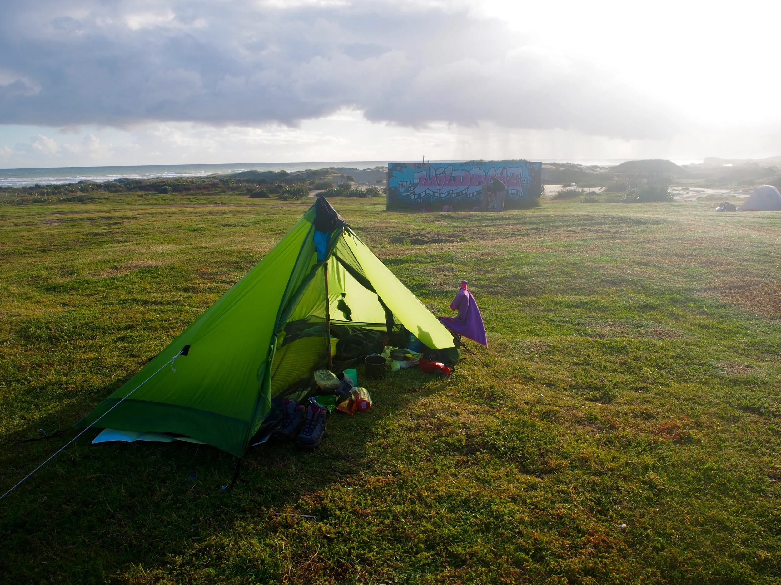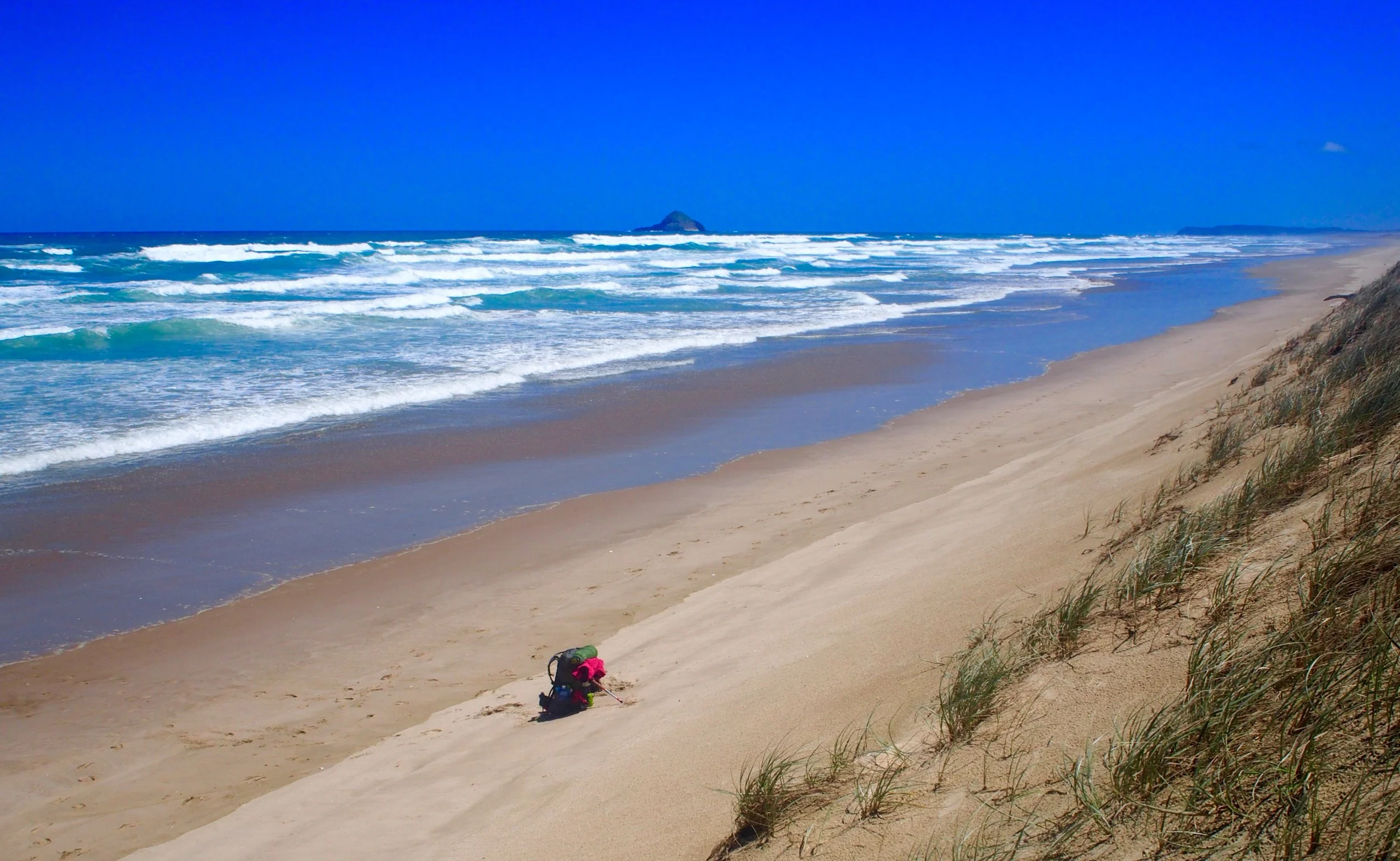 Ensimmäiselle leiripaikalle Twilight Campiin ei ollut kuin 12km. Mukavan helppo aloitus pitkälle ja vaativalle matkalle. Uuden-Seelannin pohjoisin kärki on hiekkaa, siis ihan kokonaan. Reitti kulki hiekkarannoilla ja kiipesi dyynien yli, paljon hiekkaa joka puolella. Oli mahtavaa olla vihdoinkin matkalla, jota olin suunnitellut niin pitkään. Taisin hymyillä kuin hullu koko matkan ensimmäiseen leiriin.