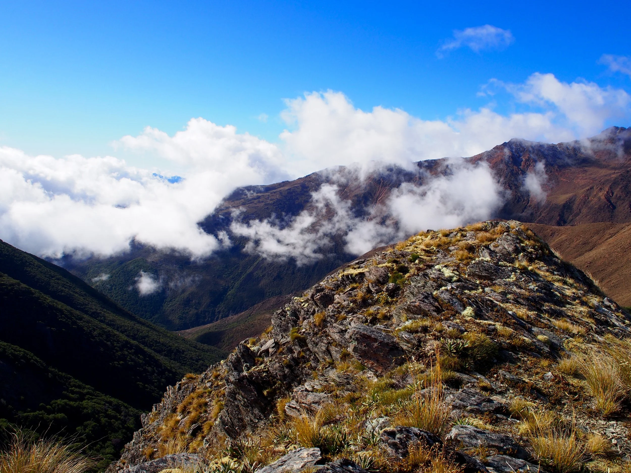 Alamäki vuorten väliin oli jyrkkä, irtonaista hiekkaa ja kiveä. Vaati täydellistä keskittymistä päästä alas ehjin nahoin. Kun lähdin nousemaan kohti seuraavaa huippua, sen ympärillä alkoi liikkua pilviä. Huipulle päästyäni sieltä ei enää nähnyt mitään, mutta ei haittaa. Olin nähnyt maisemat edelliseltä vuorelta, sitä paitsi oli jotenkin tosi kaunista, kun pilvet pyyhkivät ylitseni ja hetkittäin pystyin näkemään niiden välistä alas laaksoon. Edelleenkään ei tuullut liikaa, eikä satanut. Olin tyytyväinen, että olin jatkanut matkaa, vaikka niin moni oli kääntynyt takaisin ja varoitteli säästä. Kun pääsin alemmas vuorelta ja takaisin metsän siimekseen, melkein juoksin lopun matkaa Rintoul Hutille. Kaamea nälkä, olihan aamupalasta jo noin neljä tuntia ja muutaman kalorin olin saattanut matkalla polttaa. Tonnikalawrappiä syödessäni tutkailin tuvan "aikomuskirjaa" (intentions book, johon kaikkien tulisi kirjoittaa milloin ovat olleet paikalla ja mihin suuntaan menossa), niistä on aina kiva lueskella ihmisten kommentteja säästä ja kaikesta muustakin.