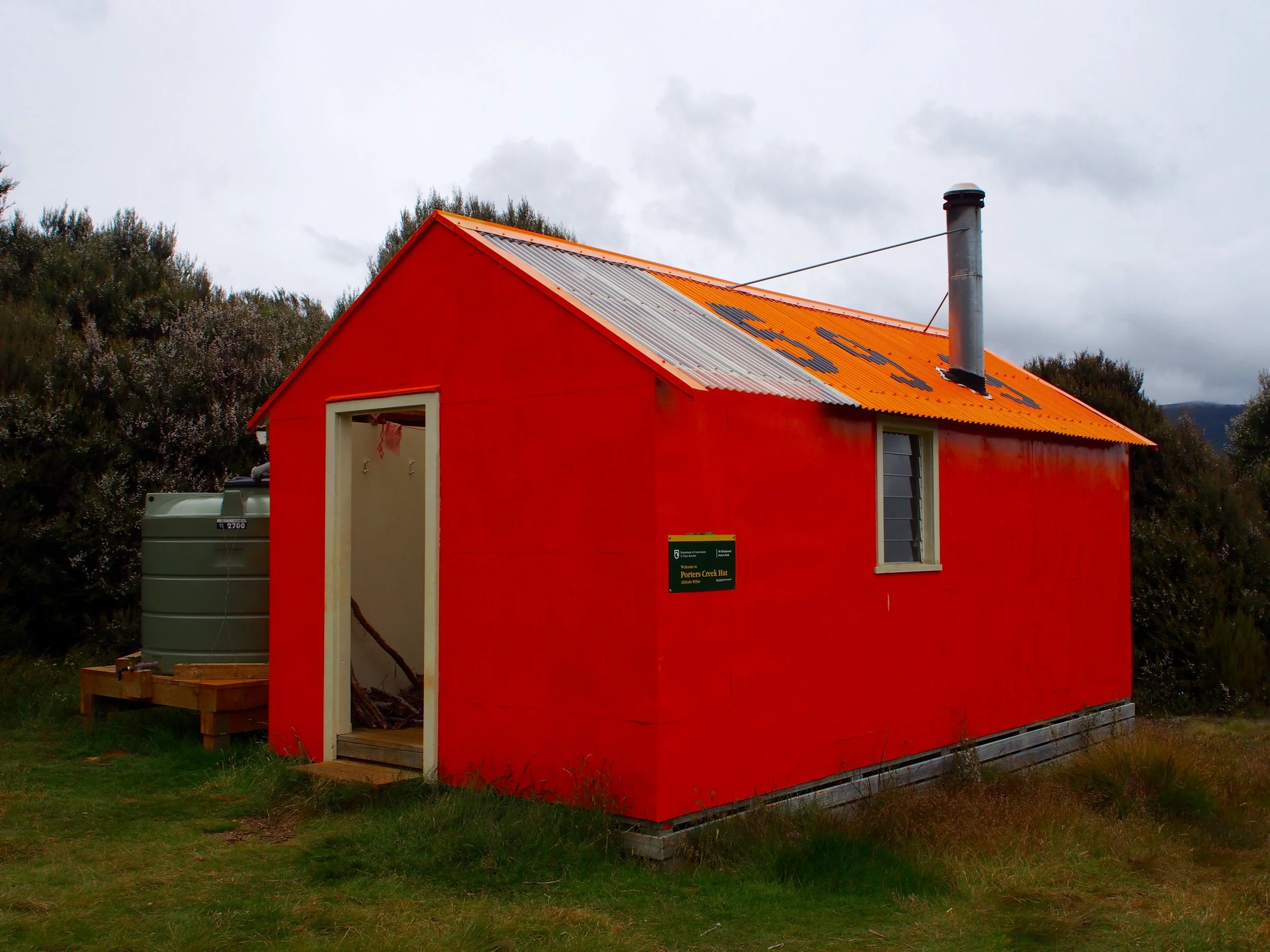 Seuraavalle tuvalle, Porter's Creek Hutille piti mennä noin 4 tuntia, mutta jo kahden ja puolen tunnin jälkeen näin kirkkaan oranssin majan alhaalla laaksossa, kun ylitin korkeaa harjannetta. Perillä tarkastin heti tuvan kirjan ja kyllä, amerikkalaiset olivat jääneet tänne yöksi, eivätkä jatkaneet eteenpäin kuten olivat uhonneet. Kuuden hengen tuvalla oli siis ollut 12 henkeä. Olin oikein tyytyväinen että olin jäänyt Hunters hutille yöksi. Vatsa ilmoitti että oli lounasaika, kaivoin siis tonnikalat ja wrapit esille ja istuin tuvan pihalle syömään. Hetken päästä jouduin kuitenkin siirtymään sisälle kun tuuli yltyi liian kylmäksi. Ann-Claire ja Matthieu ilmestyivät myös majalle kun olin jo valmis jatkamaan matkaa.