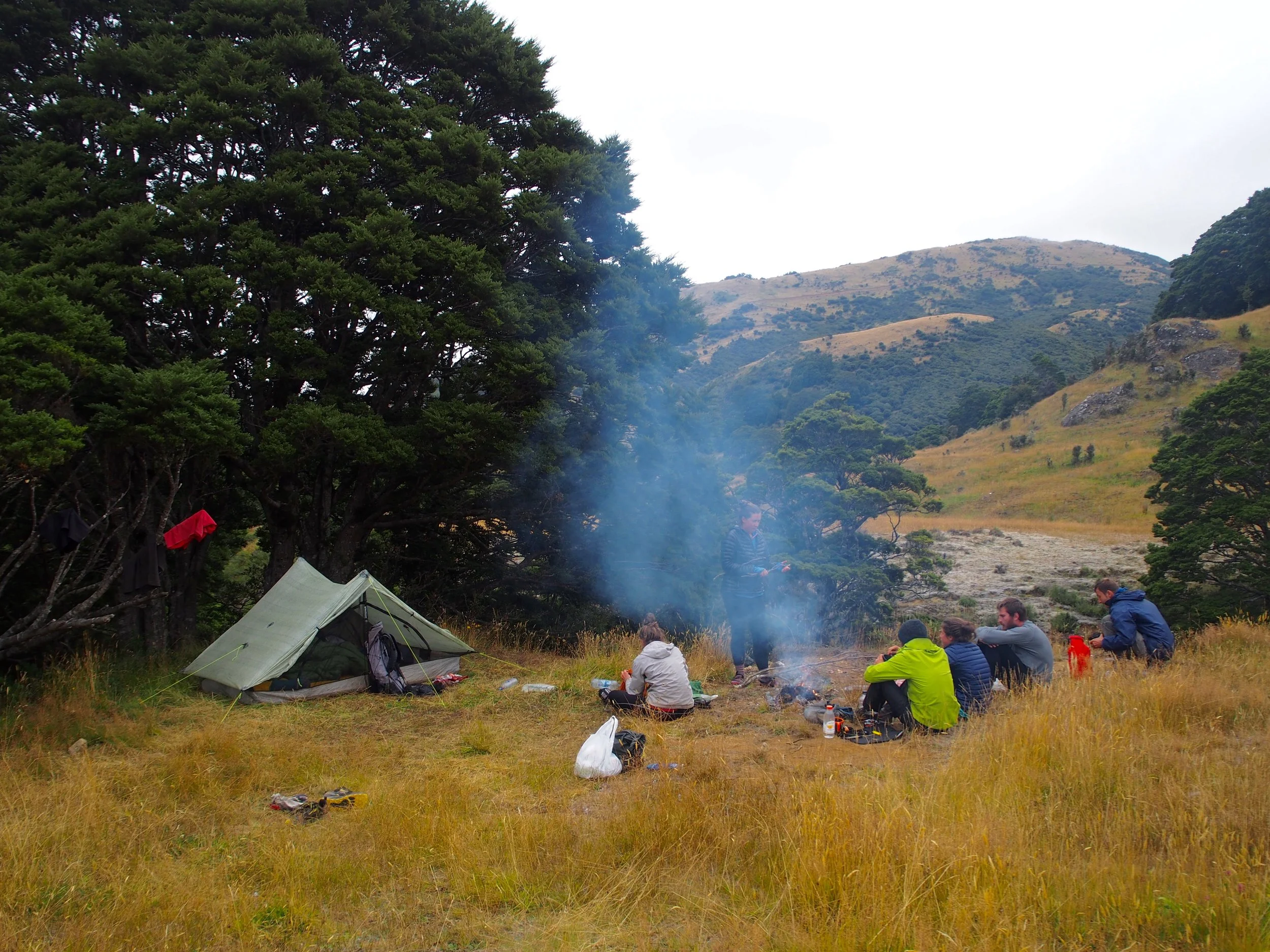 Nousimme noin 500 metriä ylöspäin harjanteelle, josta polku laskeutui taas alas ja pois metsästä. Aurinko tuntui tosi kuumalta kun emme olleet puiden suojassa, tussock-ruoho oli korkeimmillaan melkein rintaan asti, ruohotupsujen välissä oli piilossa syviä kuoppia, joten oli katsottava tarkkaan minne jalkansa laittaa. Yritin huitoa ruohoja pois edestä sauvoilla, mutta silti eteneminen oli hidasta ja kompastelin koko ajan. Reittimerkkeinä toimivia oransseja tolppia oli vaikea nähdä korkean ruohon seasta. Onneksi polku sukelsi välillä takaisin pyökkimetsään. Päivä tuntui tosi pitkältä, olimme perillä Aparima Hutilla vasta seitsemän aikaan illalla. Tuvassa oli jo muutama asukas, mutta saimme vielä punkat. Porukkaa tuli vielä meidän jälkeenkin, loppujen lopuksi meitä oli tuvalla yli kymmenen, osa telttaili pihalla.