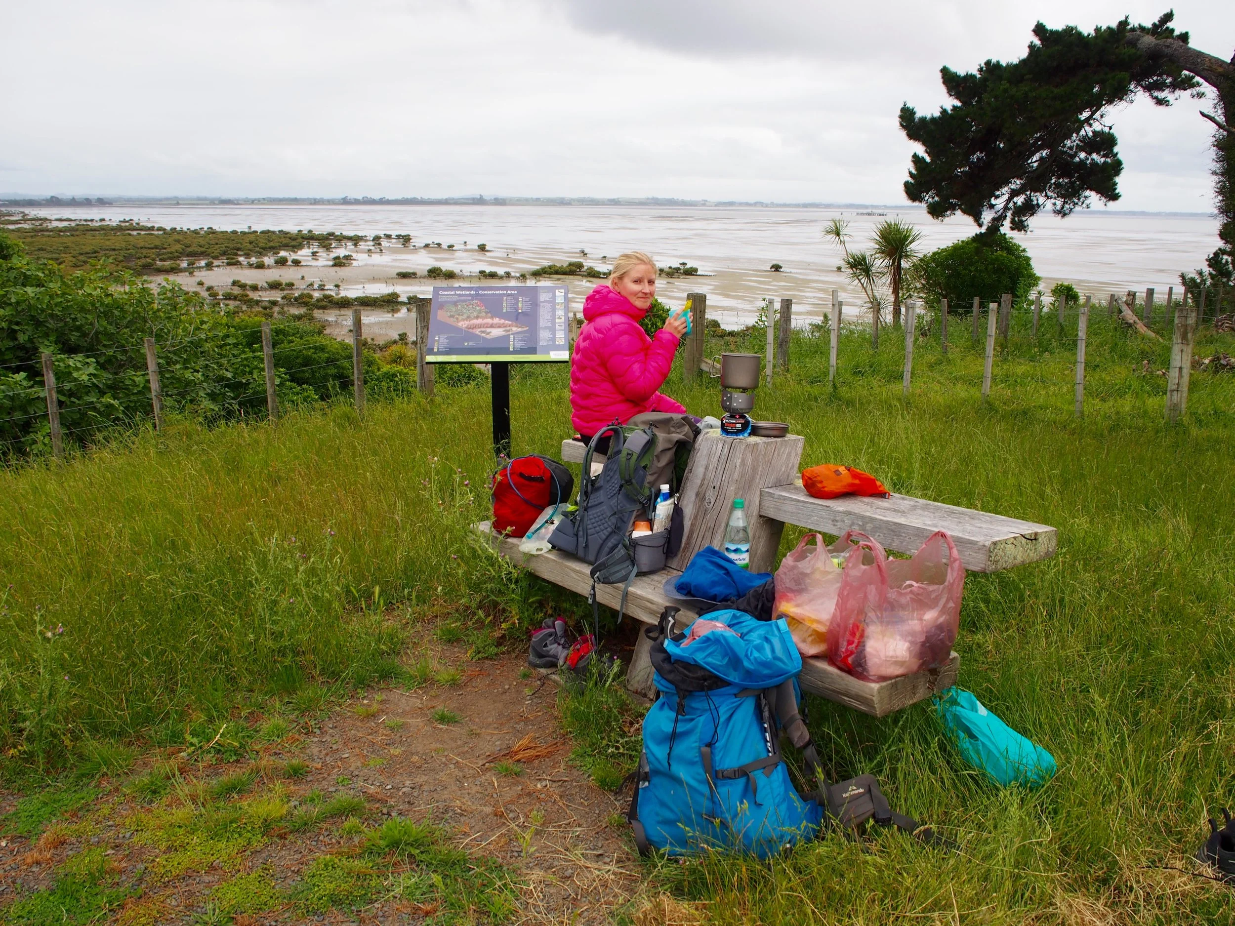 En ollut nähnyt Anthonya Herekinon metsän jälkeen, joten oli mukava vaihtaa kuulumiset pitkästä aikaa ja jatkaa matkaa taas tutun vaelluskaverin kanssa. Kuvittelin että kävelisimme vielä koko päivän kaupunkiympäristössä, mutta reitti yllättikin positiivisesti muuttumalla heti alkuun maalaismaisemaksi vihreine peltoineen ja lampaineen. Ennen lentokenttää jouduimme kyllä ohittamaan jätevedenpuhdistamon, mutta taisi tuulla merelle päin koska emme kärsineet hajuhaitoista. Hieman ennen lentokenttää löysimme tien viereltä jonkunlaisen leirin, oli telttaa, tiipiitä ja pressukatosta ja koko rakennelma näytti valtaukselta tai vastaavalta. Telttojen luona istui nainen, jolta me tietysti kyselemään, että mitäs täällä tapahtuu. Nainen oli maori, ja kertoi meille että he ovat olleet jo kuukauden osoittamassa mieltään koska leiriä ympäröivälle maalle ollaan suunnittelemassa asuinaluetta, eikä maorien mielipidettä asiaan oltu kysytty ollenkaan. Kyseessä oli alue jolle maorit alun perin saapuivat ensimmäisenä Uudessa-Seelannissa. Meidät kutsuttiin peremmälle, istuimme siellä aika pitkään kuuntelemassa maoritarinoita, juomassa kaakaota ja syömässä keksejä.