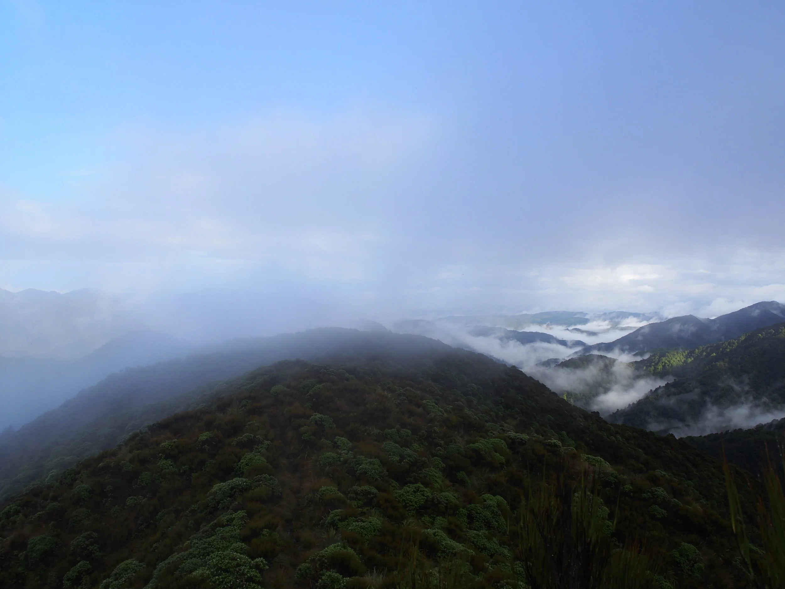 Jacob oli neuvonut minulle vaihtoehtoisen reitin ensimmäiselle autiotuvalle, joka olisi kuulemma mukavampi ja vähemmän mutainen kuin Te Araroan mukainen polku. Ensimmäisestä risteyksestä en siis lähtenytkään seuraamaan Te Araroan reittimerkkejä, vaan käännyin vasemmalle ja lähdin kävelemään Ohau-joen vartta. Parin tunnin päästä käännyin ylös Gable End-harjanteelle, joka yhdistyisi ylempänä Te Araroa-reittiin. Ylämäki oli raskasta nousta, välillä joutui vähän kiipeilemään puiden juuria apuna käyttäen, nousu oli niin jyrkkää. Joki oli reilussa sadassa metrissä, reitin korkein kohta oli 985 metriä korkea Richards Knob, nousua tuli siis reilusti. Rinkassa oli ruokaa melkein viikoksi, se tuntui todella painavalta, eikä yhtään helpottanut matkantekoa. Kiipesin, kiipesin ja kiipesin, tuntui ettei ylämäki lopu koskaan. Puuraja on täällä todella ylhäällä, noin tuhannessa metrissä. Saatat siis olla hyvinkin korkealla, mutta et näe mitään, koska kasvusto on korkeillakin harjanteilla niin tiheää. Koko päivän aikana näin yhden ihmisen, se oli joku paikallinen päiväretkeilijä, joka tuli harjanteella vastaan pieni päiväreppu selässä.