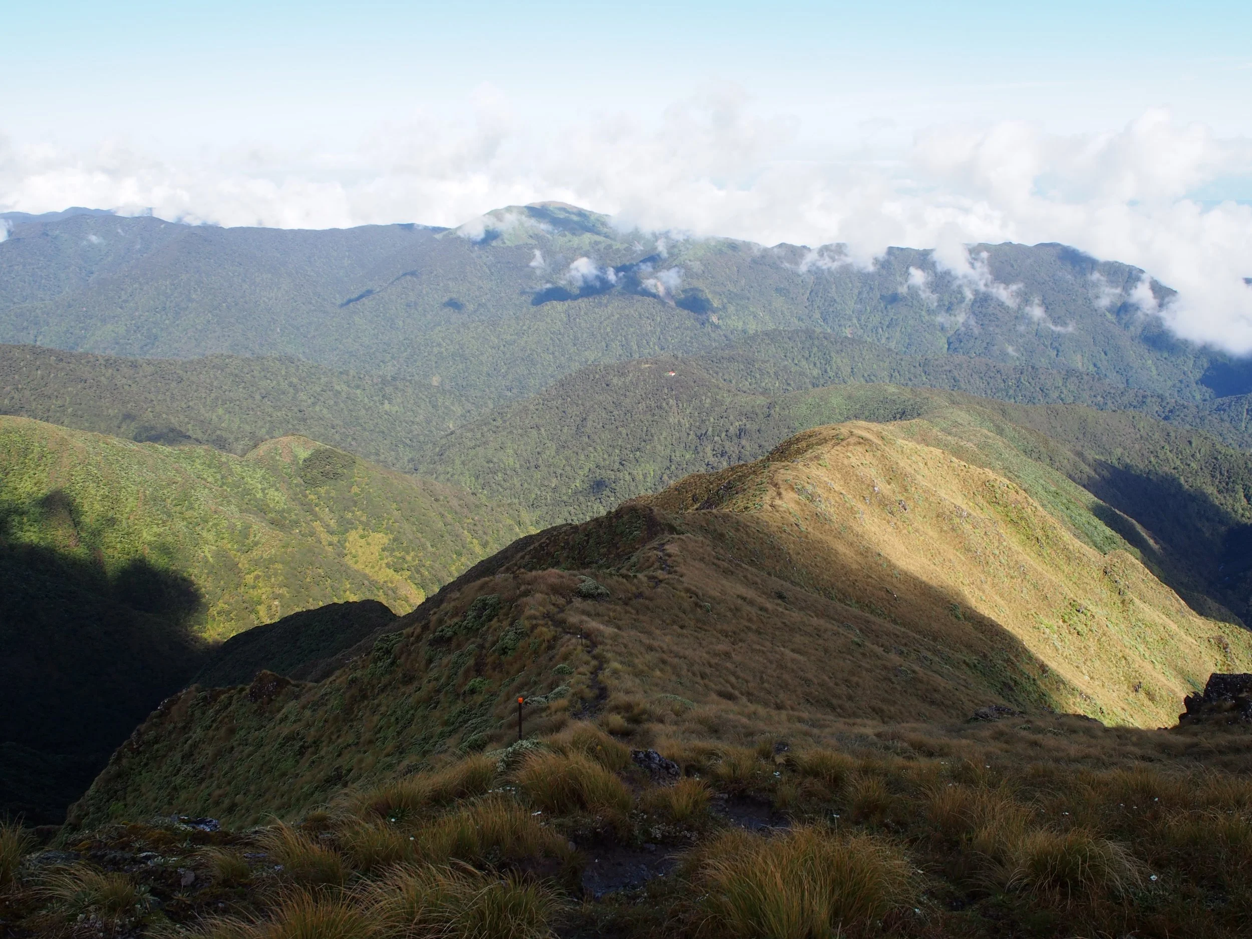 Lähdin ensimmäisenä majalta nousemaan kohti Pukematawain huippua, joka oli melkein 600 metriä korkeammalla. Nousu oli kuitenkin melko helppo ja maisemat paranivat hetki hetkeltä, kun pilvet vihdoin väistyivät auringon tieltä. Vajaassa kahdessa tunnissa pääsin Pukematawain huipulle, josta reitti haaraantui kolmeen suuntaan. Lähdin kyltin osoittamaan suuntaan, Dracophyllum hutille. Se oli pieni autiotupa, jossa on vain kaksi punkkaa. Olin suunnitellut syöväni lounaan siellä ja jatkavani vielä seuraavalle Nichols Hutille. Polku seurasi kapeaa harjannetta yli 1000 metrin korkeudessa. Muuten se oli todella hieno, maisemat molemmin puolin harjannetta olivat upeat, mutta valitettavasti mutaa oli paljon. Ja se oli liukasta. Muutama läheltä-piti-tilanne ja lipsahdus pisti taas kävelemään vähän varovammin. Harjanteella tuuli jonkun verran, mutta ei liian kovasti. Takin huppu päässä sitä ei edes huomannut.