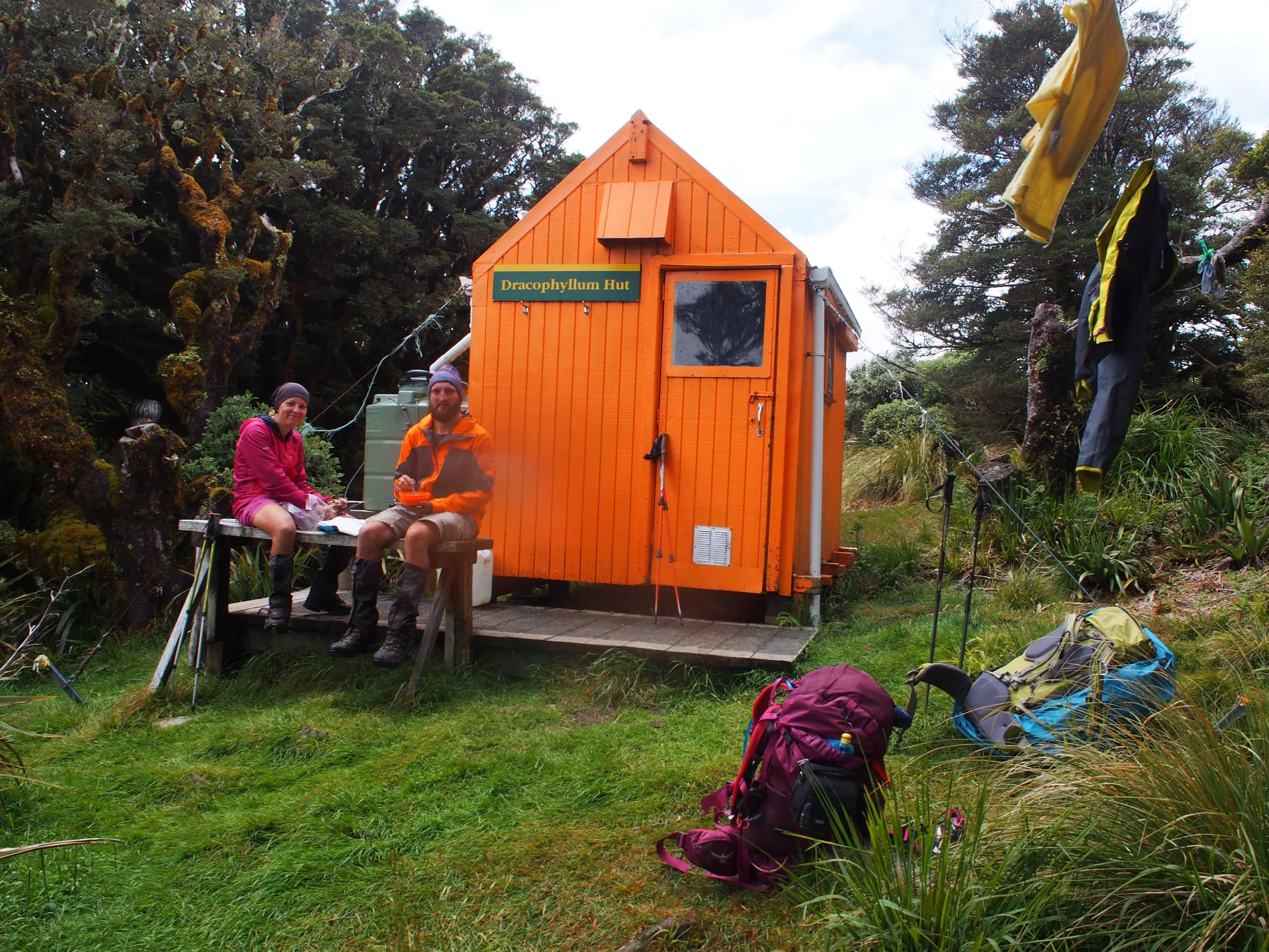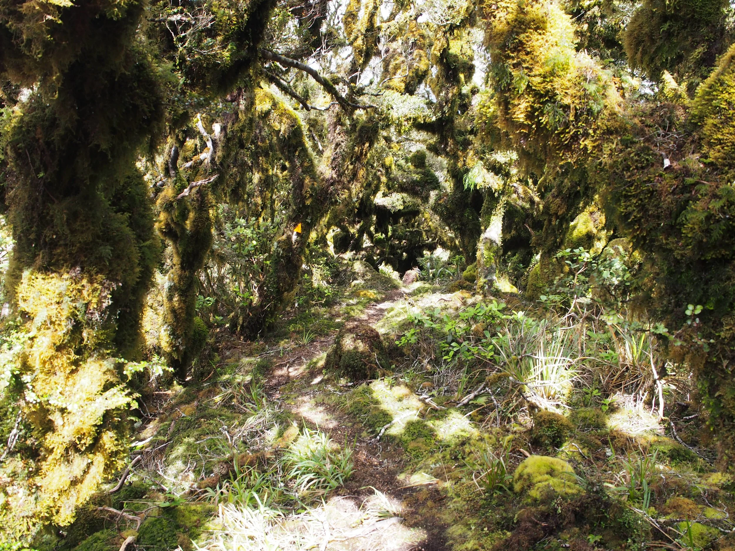 Vähän ennen Dracophyllum Hutia polku sukelsi metsään, olin laskeutunut puurajan alapuolelle. Kaikki puut oli paksun sammalen peitossa, oikea peikkometsä! Pikkuinen oranssi maja löytyi keskeltä tätä peikkometsää, istuin rappusille syömään lounasta. Vain noin kymmenen minuuttia minun jälkeeni Griggs ilmestyi paikalle, puolen tunnin päästä myös Kerstin ja Oliver. Matkaa lähtöpaikasta majalle oli vain 8 km, mutta meillä kaikilla meni siihen melkein viisi tuntia. Kertoo taas jotain polun luonteesta... Reittiohjeiden mukaan seuraavalle majalle olisi vain 5 kilometriä ja että siihen menisi neljä tuntia. Eli jotain vielä vaikeakulkuisempaa oli odotettavissa.