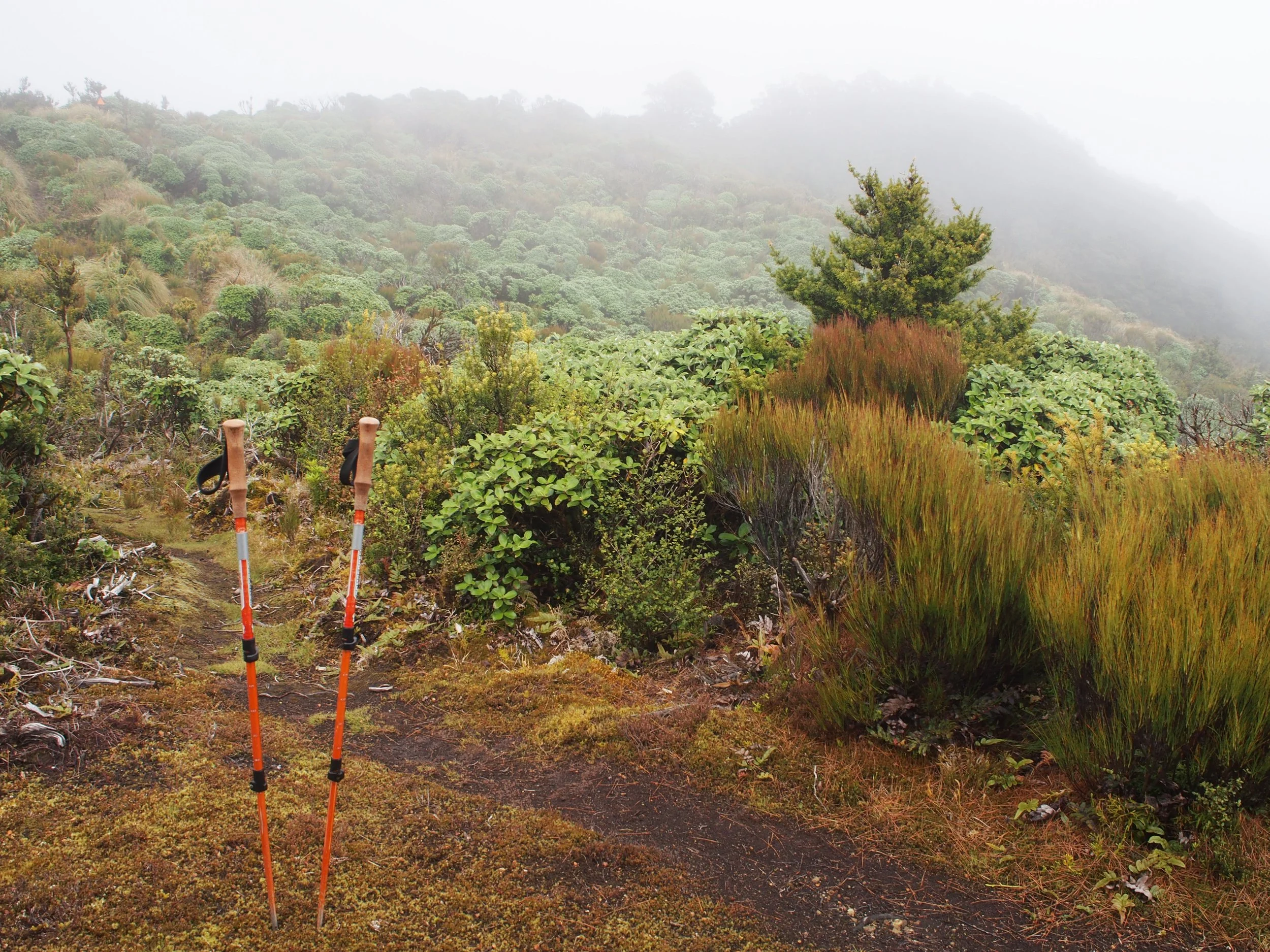 Tässä vaiheessa ei onneksi satanut kuin ihan vähän, mutta näkyvyys harjanteella oli noin 25 metriä. Reitti oli merkitty noin metrin korkuisilla tolpilla, jonka päässä oli oranssi pallukka. Tolppia olisi voinut olla vähän tiheämpään, tosin kapealta harjanteelta ei oikein voinut eksyäkään mihinkään. Lähestyessäni huippua, tuuli voimistui koko ajan, mutta ei tuntunut pelottavan voimakkaalta kuitenkaan. En oikein ollut edes varma missä vaiheessa olin huipulla, sitä kun ei oltu merkitty mitenkään. Kai se oli siinä mistä polku lähti alaspäin. Huipulta alkoi yli 1200 metrin alamäki, joka oli vaikea, mutainen ja juurakkoinen. Lisäksi alkoi sataa kunnolla. Luulisi, että alamäki olisi aina melko helppoa, mutta eipä ole. Tämä ei todellakaan ole oikea paikka polvivammaiselle, onneksi omani ovat kunnossa.