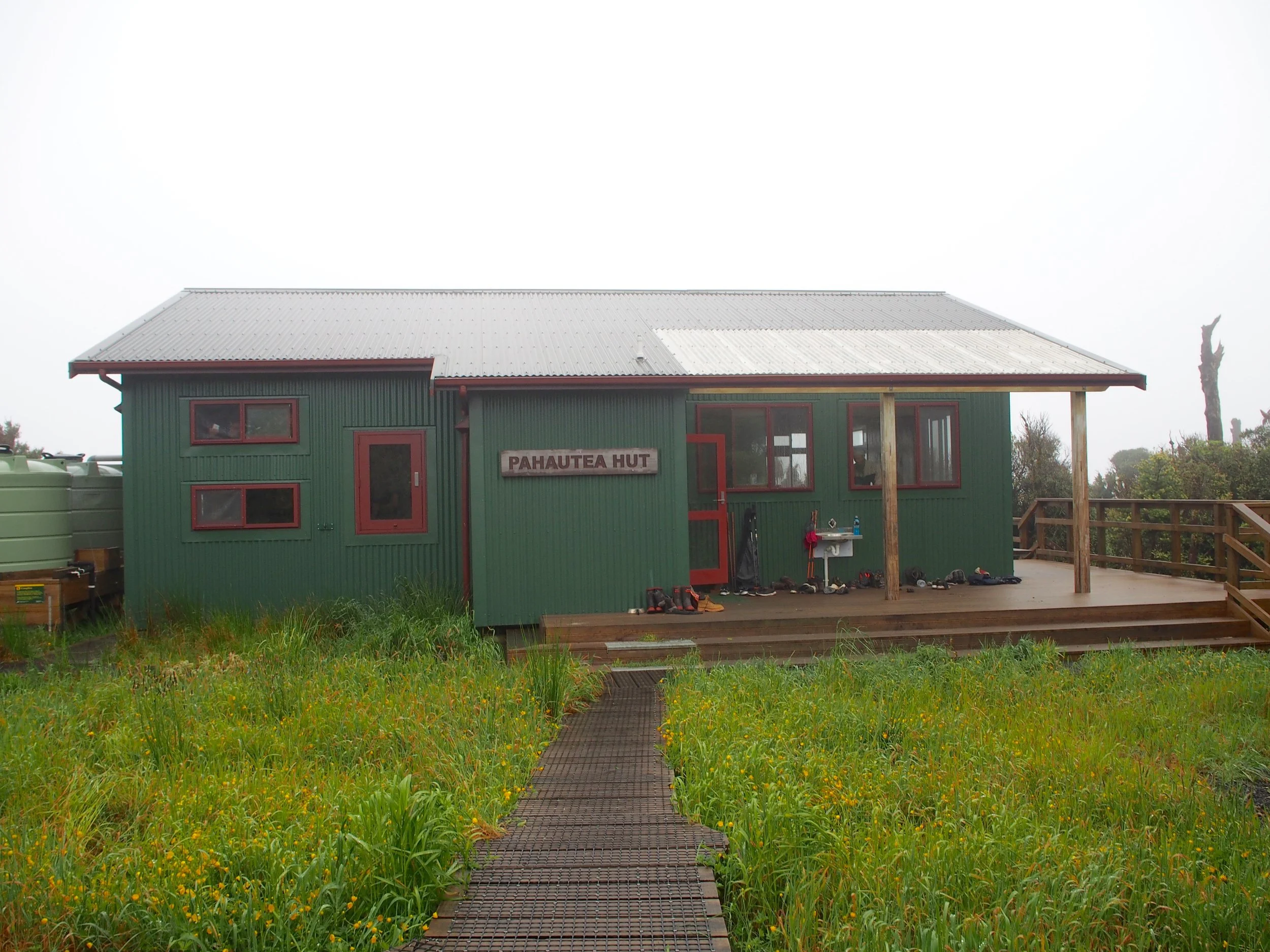 Mutta eipä pidä juhlia liian aikaisin, hyvin pian tämän jälkeen polku muuttui jyrkäksi, eikä mennyt pelkästään ylöspäin, vaan vähän väliä oli myös jyrkkiä alamäkiä. Ei, en halua mennä alaspäin! Tuntui niin turhalta mennä kymmeniä metrejä alaspäin, kun tiesin että ne joutuu kohta kiipeämään uudestaan. Viimeiset pari kilometriä oli todella hidasta könyämistä, kaikki oli ihan läpimärkää ja heti jos pysähtyi, tuli kylmä. Melkein neljän tunnin kävelyn ja kiipeämisen jälkeen pääsin huipulle. Mutta kuten saatoitte jo arvata, huippu oli sankassa pilvessä eikä minkäänlaisista näköaloista ollut toivoakaan. Olin joutunut pitämään kameran repussa koko päivän sateen takia, eikä sitä siis tarvinnut kaivaa esille huipullakaan. Huipulta oli noin puolen tunnin kävely Pahautean majalle, joka on DOC:in (Departmen of Conservation) ylläpitämä "autiotupa". Aikaisemmin täällä oli vain pieni 6 hengen maja, mutta pari vuotta sitten rakennettiin vanhan majan viereen uusi, jonne mahtuu 16 henkeä. Lisäksi majassa on tilava ruokailu/kokkaustila, vesihanat ja tiskialtaat. Ulkopuolella oli jopa jalkojen/kenkien pesupiste, joka tulikin tarpeeseen mutaisten kenkien kanssa.