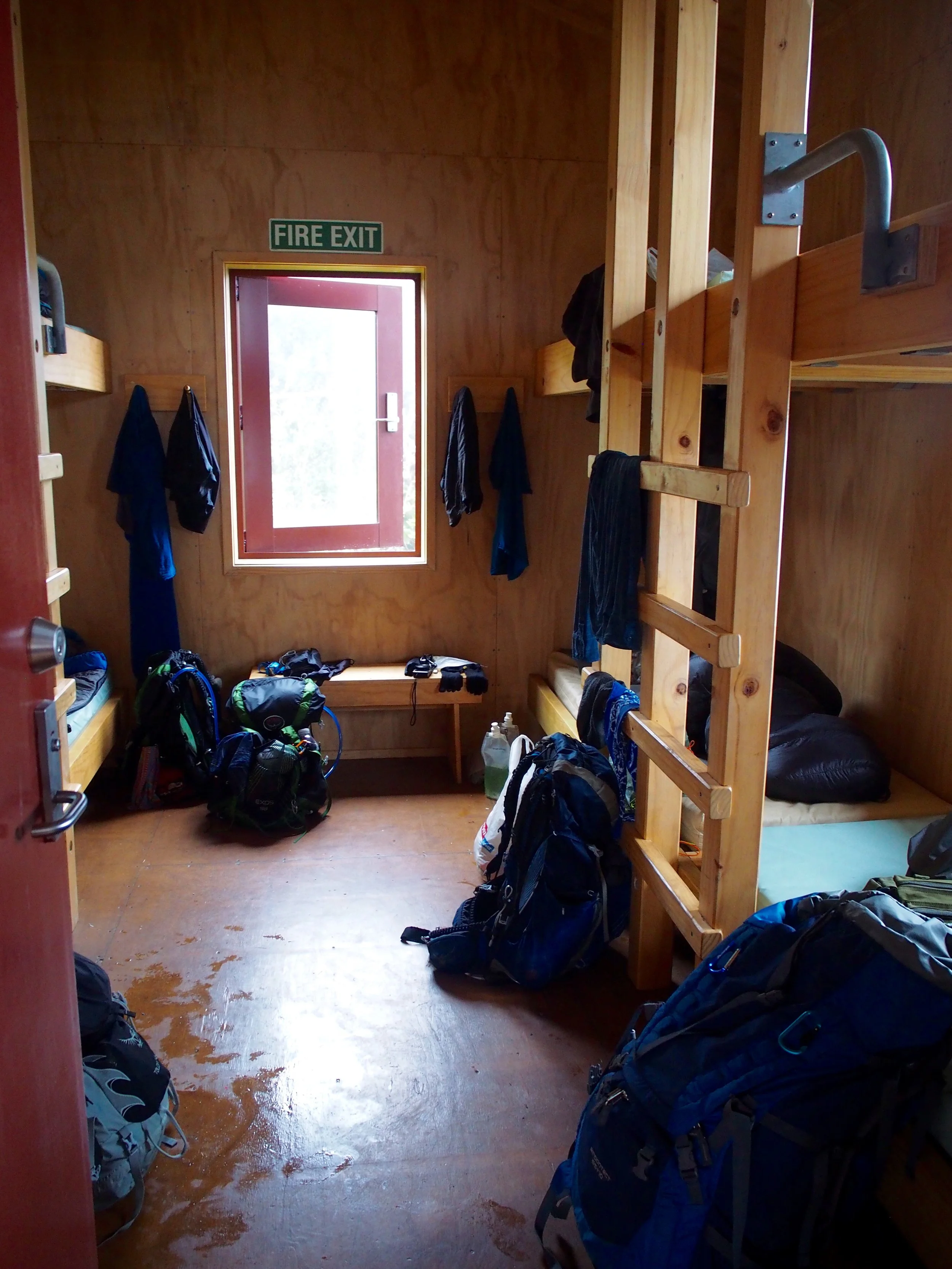 Vähitellen muitakin vaeltajia alkoi saapua paikalle, valtasimme toisen majan kahdesta makuuhuoneesta, jossa oli makuupaikat kahdeksalle. Olin vaihtanut kuivat vaatteet päälle kun tulin majalle, mutta palelin vielä pitkälle iltapäivään ja join monta kuppia kuumaa kaakaota. Jossain vaiheessa majan pihalle alkoi kerääntyä koululaisia. Se tästä vielä puuttuisikin, kouluryhmä täällä yhtä aikaa! Koululaisten opettaja kävi majassa ja kertoi että heitä tulisi yhteensä 30! Puolella koululaisista oli teltat, joten vain 15 piti saada mahtumaan sisätiloihin. Me saimme pitää oman huoneemme vaeltajien kesken, koululaiset majoittuivat toiseen huoneeseen ja vanhaan tupaan. Uudessa-Seelannissa on paljon näitä DOC:n ylläpitämiä majoja, niitä saa käyttää kunhan on ostanut Hut Passin, joka maksaa puoleksi vuodeksi 90 dollaria (noin 63€). Tämä oli ensimmäinen maja Te Araroan varrella, mutta niitä tulisi olemaan jatkossa enemmän, varsinkin Eteläsaarella.