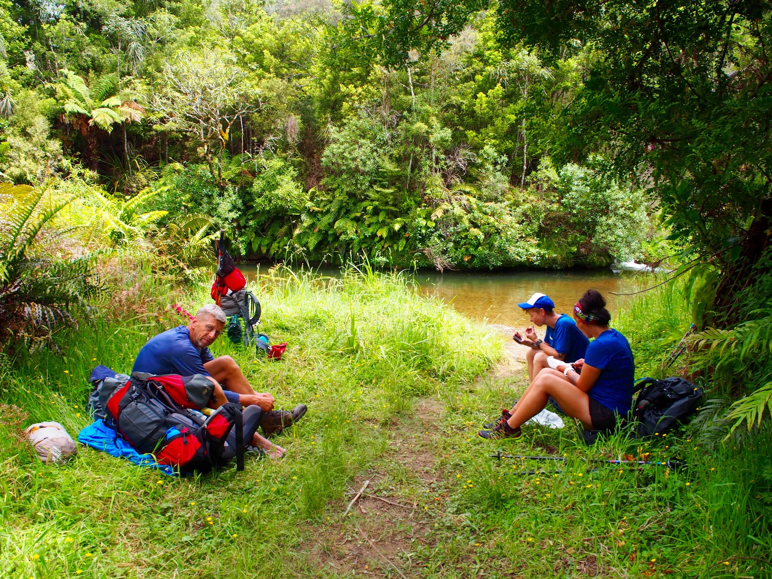 Olin lähtenyt liikkeelle aikaisemmin kuin Michelle ja Jack, joten kävelin tarkoituksella aika hitaasti, odottaen että he saisivat minut kiinni. Ilmeisesti he olivat juoneet aamukahvit hyvin rauhassa, koska heitä ei kuulunut. Reitillä oli yksi joen ylitys, josta oli varoitettu, että sateiden jälkeen veden pinta saattaa olla vaarallisen korkea. Vaikka viimeiseen vuorokauteen ei ollut satanut kuin vähän, olin vähän huolissani ylityksestä. Kun tulin joelle, huomasin että huoleni oli turha, vettä oli vain noin polviin asti. Otin kengät pois ja kahlasin toiselle puolelle. Levitin kenkäni ja sukkani kuivumaan ja kaivoin lounastarpeet esiin. Ruokalistalla oli jälleen, yllätys yllätys, tortillawrappejä ja tonnikalaa juuston kera. Hetken päästä Jeff ilmestyi joen toiselle puolelle, otti kengät pois ja lähti kahlaamaan yli. Jeffillä ei ollut sauvoja ja rinkkakin näytti painavalta, meno oli vähän huteran näköistä liukkailla kivillä. Yhtäkkiä Jeff horjahti ja otti tukea tietenkin juuri sillä kädellä jossa piti kenkiä. Nahkaiset vaelluskengät upposivat juuri sen verran jokeen että varmasti kastuivat. Kahlasin viemään sauvan kiroilevalle miehelle ja niin hänkin pääsi turvallisesti joen yli. Ei mennyt kauaa kun Michelle ja Jack saapuivat myös paikalle. Jatkoimme matkaa yhdessä, loput reitistä olikin helppoa metsätietä ja viimeiset pari kilometriä autotietä. Noin tunti ennen Waitomoa alkoi sataa, onneksi olin varannut jo etukäteen sänkypaikan YHA hostellista. Waitomo on kuuluisa kalkkikiviluolista, joissa elää kiiltomatoja. Michelle ja Jack aikoivat jäädä ylimääräiseksi päiväksi Waitomoon ja mennä tutustumaan luoliin. Minä kävin niissä retkellä jo kun olin Uudessa-Seelannissa kymmenen vuotta sitten, joten jätin väliin tällä kertaa.