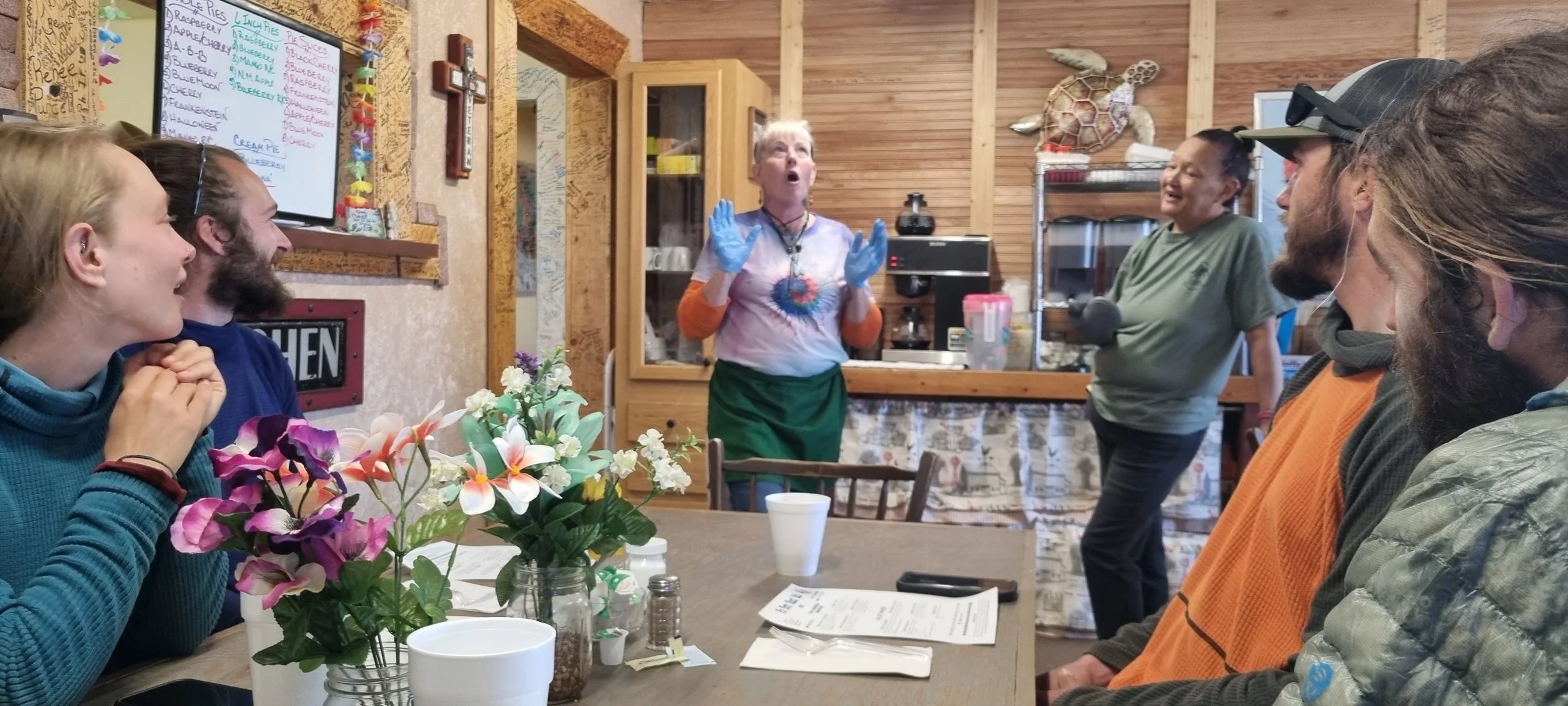Kävelimme Ohana Cafe:hen aamupalalle. Pie Town on tosi pieni, kaikki on korkeintaan 10 minuutin kävelymatkan päässä. Ohanan aamupala oli herkullinen ja henkilökunta tosi mukavaa. Kyselimme suosituksia parhaasta piirakasta ja saimme maistiaisia eri piirakoiden täytteistä. Tilasin jälkiruoaksi ravintolan nimikkopiirakan (Ohana on hawaijia ja tarkoittaa perhettä), jossa oli muun muassa kookosta, papaijaa ja ananasta. Nam!
