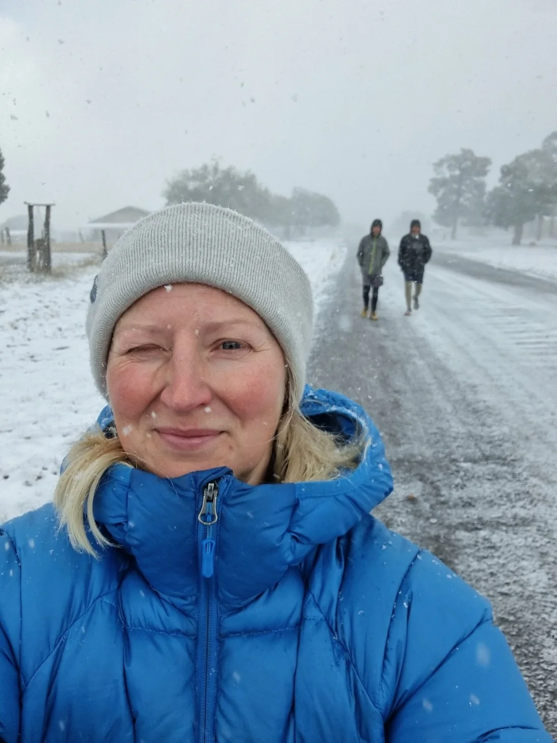 Aamulla kun heräsimme maa oli valkoinen. Ulkona oli tosi kylmä, lunta tuli vaakatasossa ja matkalla postiin alkoi tuntua siltä etten ehkä lähtisi tänäänkään vielä mihinkään. Taas Ohanaan aamupalalle, ruokalaatikon purkaminen reppuun ja lisää hengailua Toaster Housessa. Muutama rohkea lähti matkaan kun lumisade taukosi ja aurinko tuli hetkeksi esiin. Sää oli edelleen niin kylmä, etten todellakaan ollut lähdössä minnekään. Kylmissään olevia vaeltajia tuli lisää ja pian Toaster Housen kaikki petipaikat sohvia myöten oli täynnä. Loput joutuisivat lattialle tai ulos telttaan. Talon omistaja Nitakin tuli illemmalla tervehtimään kaikkia, joku Nitan ystävä toi ison kattilallisen kanakeittoa, salaattia ja patonkia kaikille. Jefferson laittoi musiikkia soimaan ja tunnelma talossa oli kerrassaan mahtava. Nita vaikutti iloiselta siitä, että hänen talonsa oli täynnä vaeltajia ympäri maailmaa. Suuri kiitos Nitalle ja Jeffersonille, Toaster House on upea paikka!