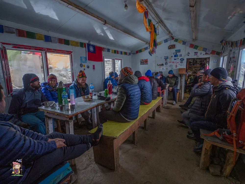 Söin lounaaksi nuudelikeittoa ja istahdin sitten majatalon kulmalle, josta löysin vähemmän tuulisen paikan. Koska minulla oli kaasukeitin mukana ja kaasuakin oli vielä jäljellä, keitin itselleni kupin kahvia. Mikäpä siinä oli auringossa istuessa ja kahvia juodessa, vuoristonäkymiä ihaillen. Porukkaa tuli koko ajan lisää, ainakin saksalaisia, espanjalaisia ja amerikkalaisia. Iltapäivällä nousimme läheistä rinnettä taas vähän ylemmäs, ainakin maisemat oli hienot ja kävellessä pysyi lämpimänä. Yöstä tulisi varmasti aika kylmä, vaikka nyt ollaankin 300 metriä alempana kuin missä telttailimme ennen Tilmanin solaa.