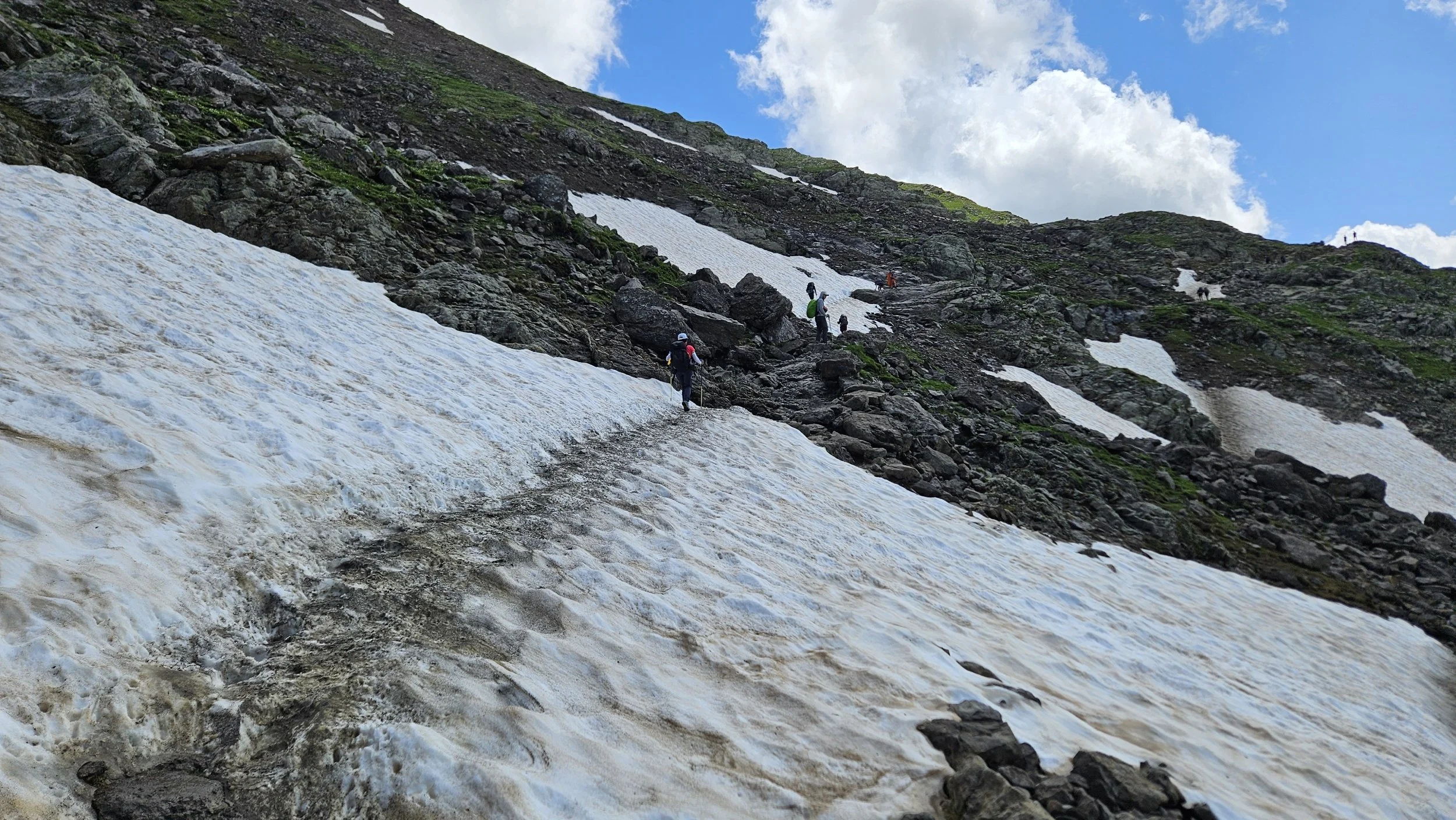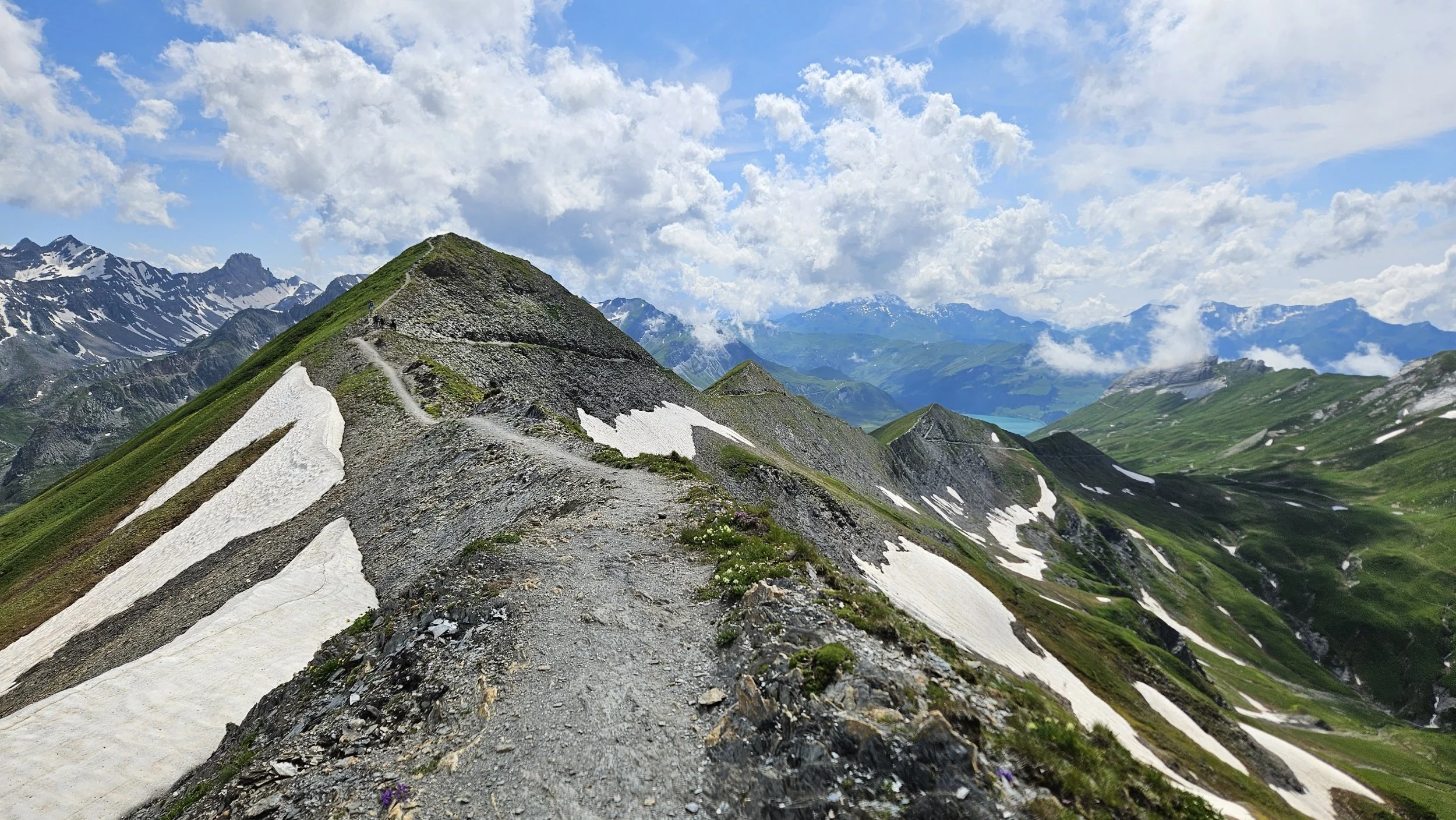 La Fayetissa vaihdoin bussiin, joka puolestaan ajeli Les Contaminesin kylään. Tästä olimme Jeffin kanssa jo kävelleet vajaa viikko sitten. Joutuisin kävelemään reilun 10 km pätkän uudelleen, jotta pääsen risteykseen missä Hexatrek erkanee Tour de Mont Blancista. Pääsin liikkeelle noin yhdentoista maissa, tuttu pätkä meni nopeasti, se on lähes kokonaan nousua, yhteensä 1300 metriä Col du Bonhommeen asti. Oli vähän outoa olla taas liikkeellä yksin, ehdin niin tottua Jeffin seuraan. Tosin tällä pätkällä oli kyllä ihan riittämiin muitakin vaeltajia, mutta ne vähenisivät kun käännyn pois Tour de Mont Blancilta.