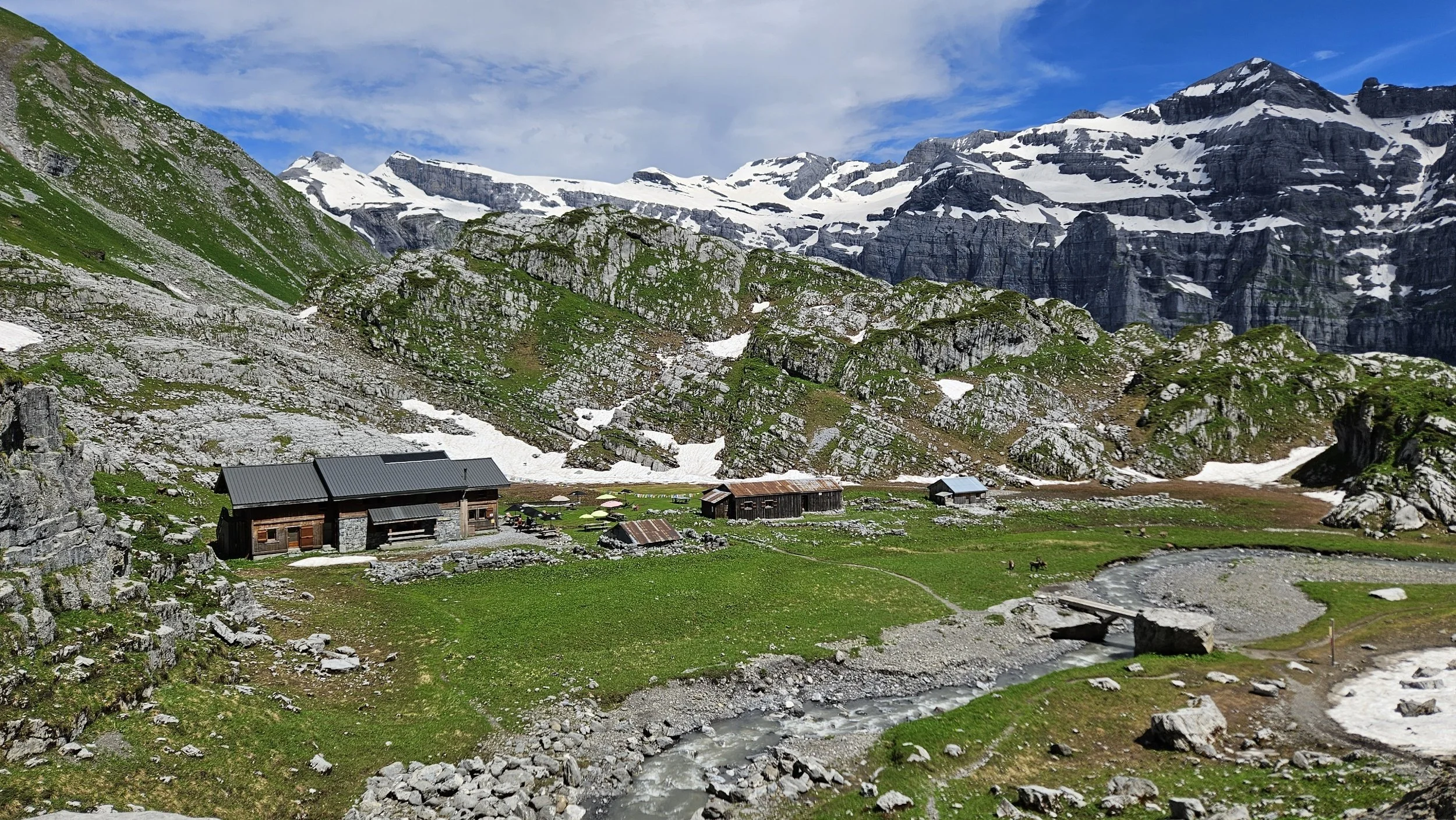 Sola oli yllättävän luminen ja jouduimme etsimään sopivaa reittiä monessa kohtaa kun liian jyrkkä luminen rinne ei ollut turvallinen mennä alas. Selvisimme kuitenkin ja pian edessä avautui näkymä Lac de Vogeallen järvelle. Vielä järven kierto ja pian olimmekin jo Refuge de Vogeallen pihalla nauttimassa kylmää kolajuomaa. Arthur jäi vielä majalle syömään lounasta kun jatkoin matkaa.