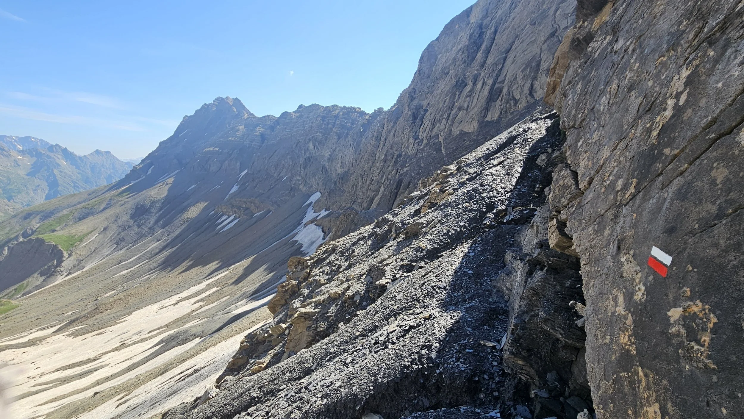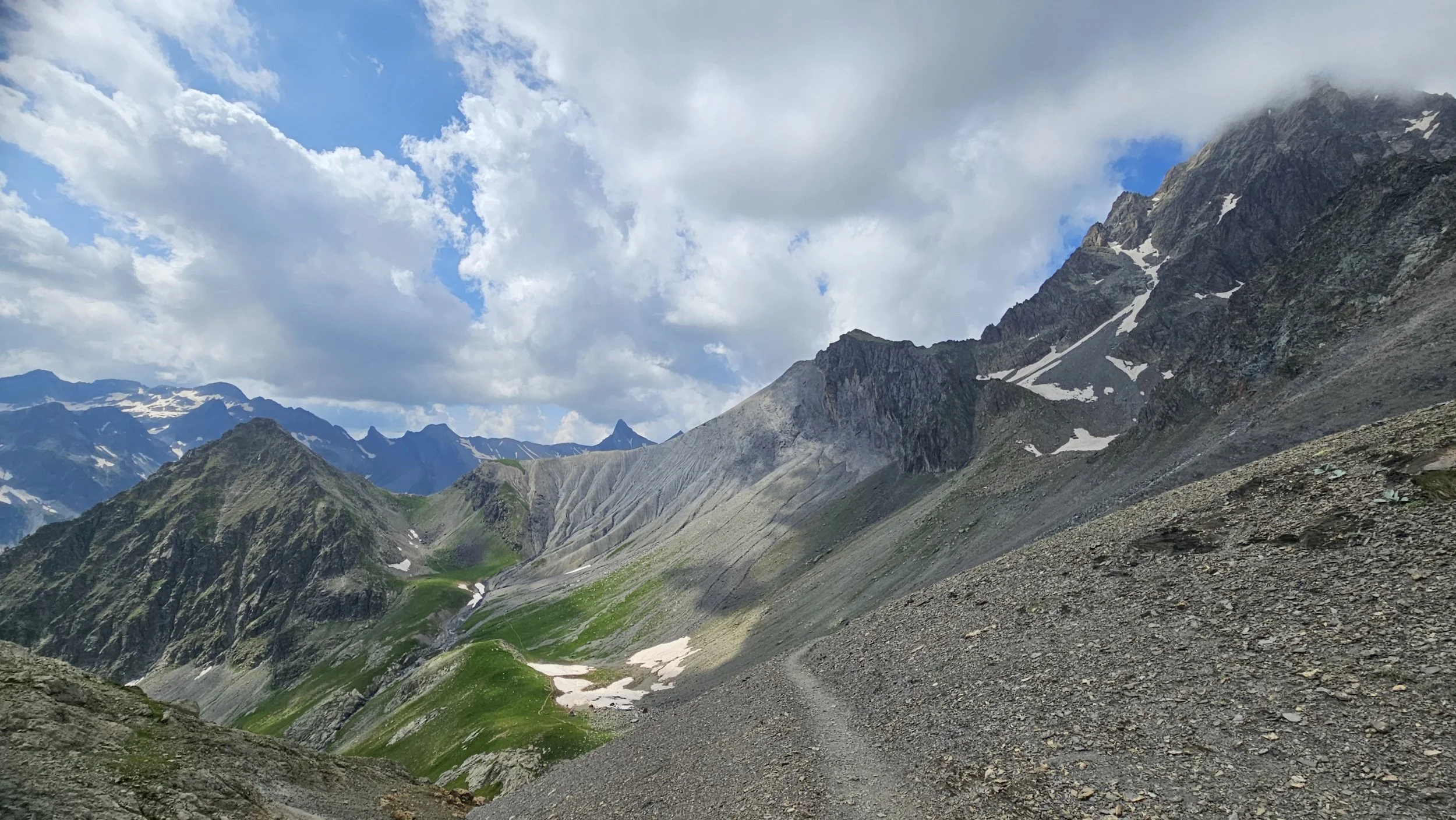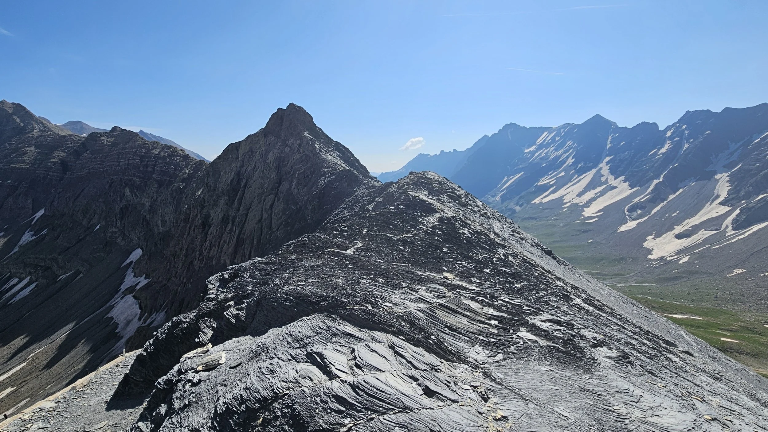 Polku vain jyrkkeni noustessaan ylös päin, ja kun vihdoin näin viimeisen solaan nousevan osuuden, piti hetki zuumailla että tuonneko oikeasti? Siinä zuumaillessa huomasin, että solasta on tulossa alas ihmisiä, eli on siinä jonkunlainen polku oltava. Juuri solan alla oleva jyrkin kohta oli liukuvaa hiekkaa ja liuskaista mustaa kiveä yhden jalan levyisellä polulla, jonka vieressö tietysti oli laakson pohjalle päättyvä pudotus. Vastaantulevien ohittaminen oli jyrkässä rinteessä aikamoista taiteilua, mutta onnistui. 2761 m korkea Col de L'aup Martin on Tour des Ecrinsin korkein kohta. Siitä polku jatkui hieman alempana traversella korkeuskäyrien mukaisesti seuraavaan Pas de Cavalen solaan. Tämäkin polku oli välillä ihan olematon ja askeleet piti asetella rinteessä huolella.